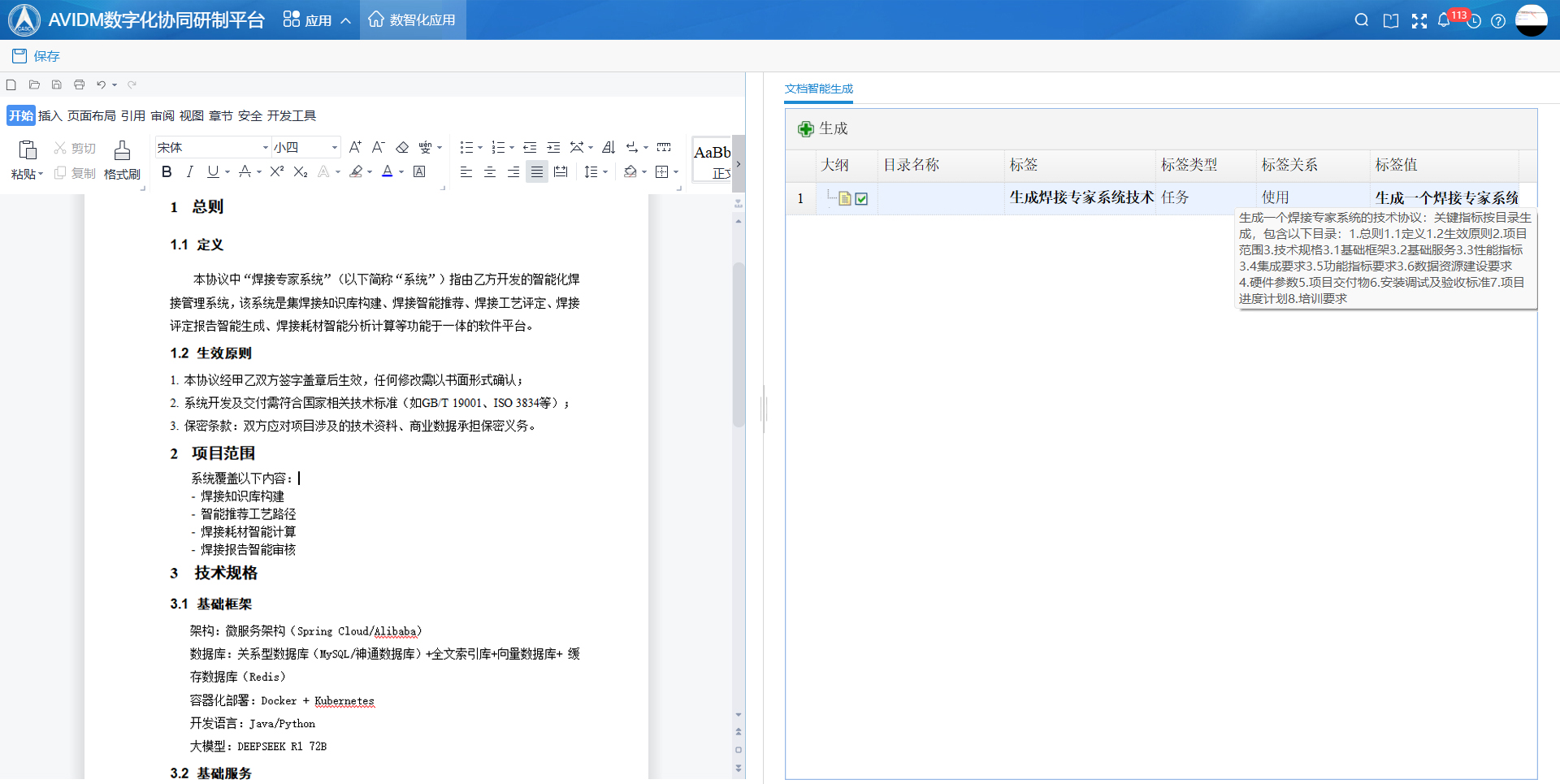 通過(guò)解析文檔模板與設(shè)計(jì)要求中的關(guān)鍵指標(biāo)和關(guān)鍵詞,調(diào)用DeepSeek大模型進(jìn)行語(yǔ)義分析,可結(jié)合科研生產(chǎn)的項(xiàng)目管理、體系論證、系統(tǒng)設(shè)計(jì)、工藝設(shè)計(jì)、生產(chǎn)制造、試驗(yàn)驗(yàn)證和運(yùn)維保障業(yè)務(wù)要求,基于歷史文檔庫(kù)的相似案例匹配,一鍵生成符合規(guī)范的技術(shù)文檔。